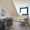 Das Schlafzimmer präsentiert sich als idealer Rückzugsort, ergänzt durch ein funktionales Arbeits- oder Kinderzimmer. Das Badezimmer ist mit Badewanne und Dusche ausgestattet; ein separates Gäste-WC mit Tageslicht sorgt für zusätzlichen Komfort.