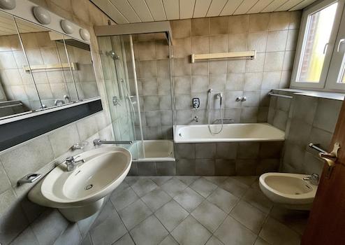 Wieder ein paar Stufen hinauf, erwartet Sie ein sehr großzügig geschnittenes Badezimmer, welches mit liebevollen Fliesen im Baumdekor deckenhoch gefliest wurde.