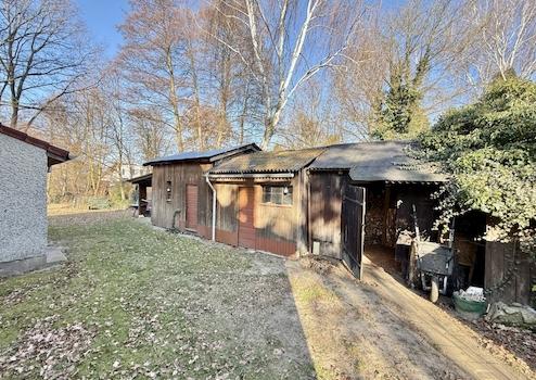 Auf dem Grundstück befinden sich zudem eine massive Garage sowie Nebengelass, das weiteren Stauraum bietet. Das Areal ist vollständig eingefriedet und bietet durch seine Größe vielfältige Nutzungsmöglichkeiten für Gartenliebhaber oder Familien mit Platzbedarf.