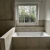 Das Schlafzimmer lädt zum Entspannen ein, während das große Badezimmer mit modernen Armaturen und viel Platz für Komfort sorgt.