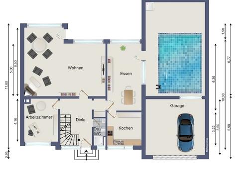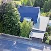 verbinden und den Blick in den großen Garten mit vorgelagerter Terrasse frei machen. Aus diesem Teil gelangen Sie dann auch in das 1971 angebaute, überdachte Schwimmbad (ca. 4x8m) mit eigener Dusche.
