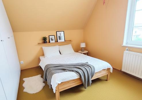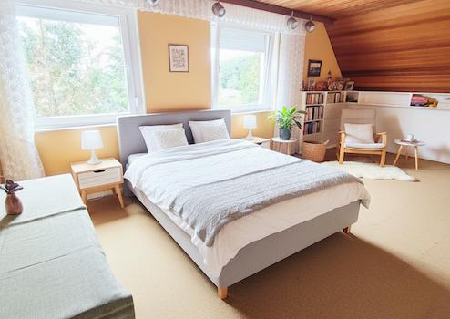 Im Obergeschoss befinden sich 5 Räume, die als Schlafzimmer, Gästezimmer oder Hobbyraum genutzt werden können. Ein Badezimmer mit separatem WC rundet die Aufteilung ab. Der vorgelagerte, schöne Balkon ist von zwei Räumen aus zu betreten und bietet einen großzügigen Ausblick in das Naherholungsgebiet. Wem das noch nicht genug Fläche im Hause ist, der baut sich ggf. noch den riesigen Dachboden aus.