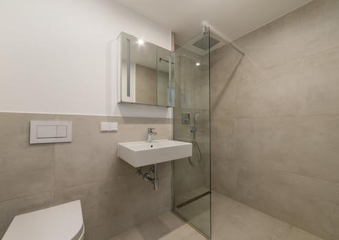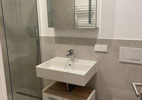 - Badezimmer mit großformatigen Fliesen und modernen Einbauten