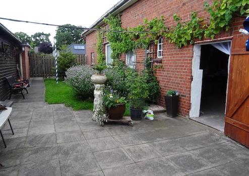 Die große Scheune und der hintere Gartenbereich mit Pool und Gartenhaus wird derzeit