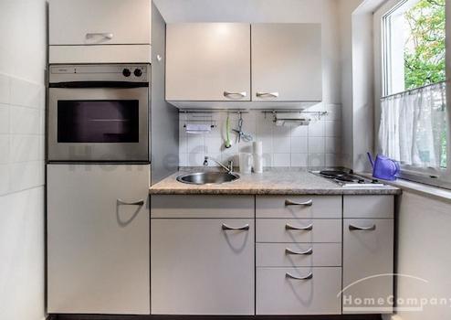 Hübsche möblierte 2-Zimmer-Wohnung mit Balkon in Schwabing, Hochparterre. Das gemütliche Wohnzimmer ist mit Schlafsofa und Esstisch für 4 Personen sowie einer Regalwand möbliert. Von hier Zugang zum Balkon mit Blick ins Grüne. Die angrenzende offene Küche ist sehr gut ausgestattet. Sie verfügt über ein Fenster und alles, was man täglich benötigt. Das separate Schlafzimmer hat ein Französisches Bett, einen geräumigen Kleiderschrank sowie eine Kommode. Das weiß geflieste Bad ist mit Dusche. Im gesamten Apartment sind heller Parkettboden (Wohn- und Schlafzimmer) und graue Fliesen (Küche und Bad) verlegt. Es steht auch ein Kellerabteil zur Verfügung. Waschküche mit Gemeinschaftswaschmaschine im Keller.