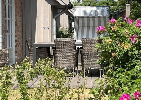 Im Außenbereich gibt es außerdem eine schöne Holz-Terrasse mit Strandkorb, Sonnenliege, Sonnenschirm und bequemen Gartenmöbeln.