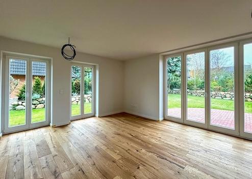 Hochwertig ausgebaute Doppelhaushälfte unter Reet mit Terrasse und Carport auf landschaftstypischem Grundstück, umgeben von einem Friesenwall