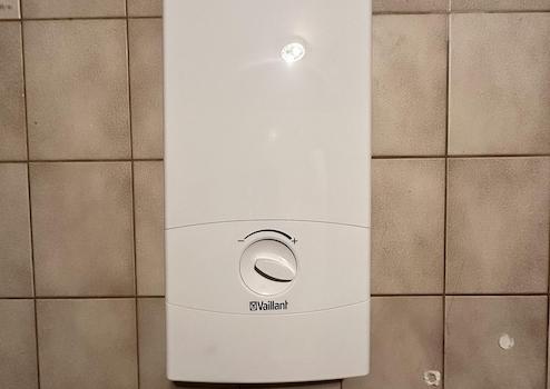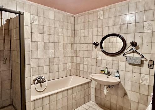 In dem ca. 6 qm Badezimmer befindet sich eine Dusche und eine Badewanne. Dort wird das Warmwasser über einen elektrischen Durchlauferhitzer von der Marke Vaillant erwärmt. (Vor knapp 3 Jahren erneuert)