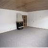 Im Wohnzimmer befindet sich ein offener Kamin und Holzdecken.