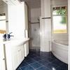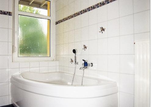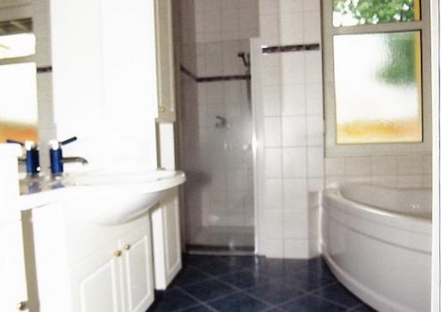 Das Tageslichtbad ist raumhoch gefliest, es verfügt über eine Eckbadewanne und eine separate Dusche mit Glastür. Des Weiteren ist das Bad mit Einbaubadmöbeln mit Ober-/Unterschränken und Ablagen sowie integriertem Spiegel mit Halogenbeleuchtung und Steckdosen ausgestattet.