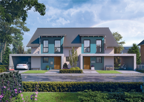 Dieses moderne Doppelhaus fällt durch die Gestaltung der Carports auch als optisch dominante Eingangsüberdachung sofort ins Auge. Bauen Sie das Doppelhaus zusammen mit symphatischen Baupartnern oder bauen Sie es allein und vermieten die zweite Doppelhaushälfte.