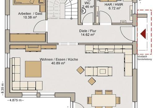 Das Haus ist projektiert und der angebotene Preis ist inkl. Grundstück. Das Grundstück wird in Kommission angeboten bzw. direkt von Dritten verkauft. Die Bauabwicklung kann kurzfristig nach Grundstückserwerb begonnen werden. Bilder und Fotos zeigen möglicherweise Sonderausstattungen, die auf Wunsch gegen Preiskorrektur zusätzlich angeboten werden können.