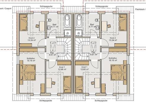 Dieses moderne Doppelhaus fällt durch die Gestaltung der Carports auch als optisch dominante Eingangsüberdachung sofort ins Auge. Bauen Sie das Doppelhaus zusammen mit symphatischen Baupartnern oder bauen Sie es allein und vermieten die zweite Doppelhaushälfte.