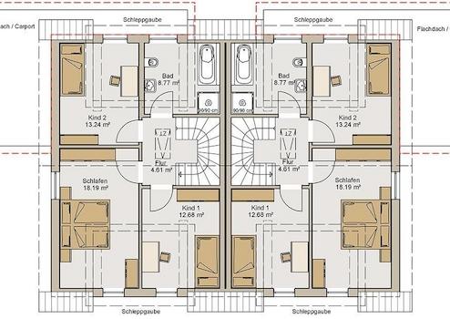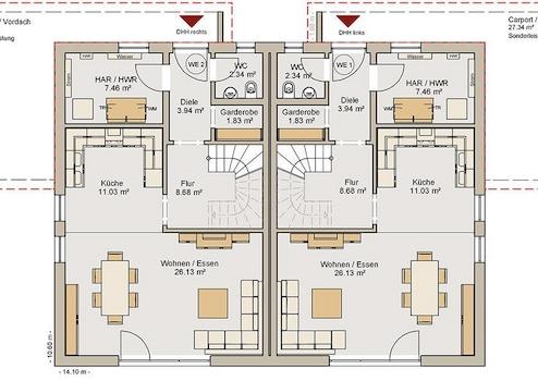 Dieses moderne Doppelhaus fällt durch die Gestaltung der Carports auch als optisch dominante Eingangsüberdachung sofort ins Auge. Bauen Sie das Doppelhaus zusammen mit symphatischen Baupartnern oder bauen Sie es allein und vermieten die zweite Doppelhaushälfte.