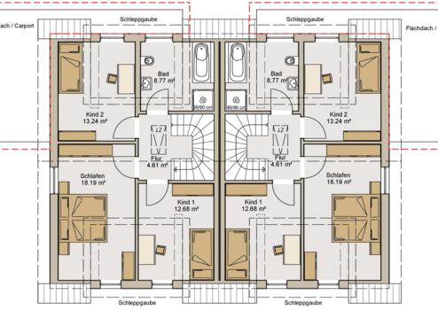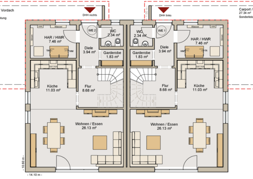 Dieses moderne Doppelhaus fällt durch die Gestaltung der Carports auch als optisch dominante Eingangsüberdachung sofort ins Auge. Bauen Sie das Doppelhaus zusammen mit symphatischen Baupartnern oder bauen Sie es allein und vermieten die zweite Doppelhaushälfte.
