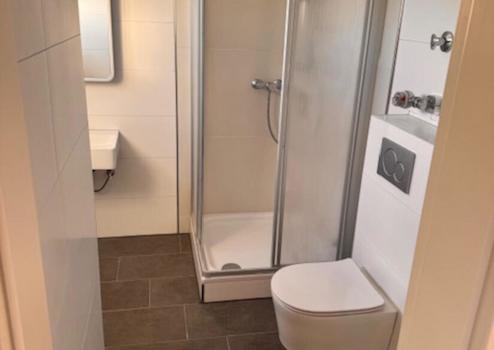 * Bad mit Dusche, Handwaschbecken, WC und Handtuchheizkörper