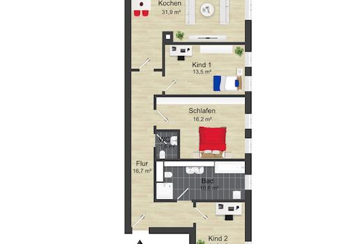 Die 4-Raumwohung im 1. Obergeschoss rechts ist wie folgt aufgeteilt: