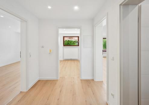 Ein feuchtigkeitsgesteuerter Abluftsensor im Bad reguliert automatisch das Raumklima und schützt vor Feuchteschäden. Handgefertigte Edelstahl-Übergangsschienen aus regionaler Produktion (Dettenhausen) runden das Gesamtbild ab.