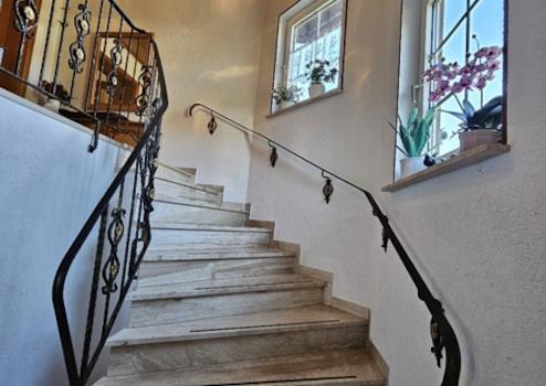 Die grosse Hauptwohnung liegt im Hochparterre, erreichbar über eine schön geschwungene, imposante Marmortreppe mit Garderobe. Durch 2 Flügeltüren gelangt man in die grosse Empfangsdiele von der sich der Wohnbereich und auf der anderen Seite der Schlafbereich erstreckt. Hier befindet sich ebenfalls ein Gäste-Wc.