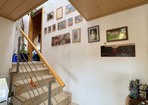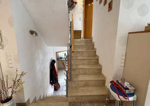 Im Erdgeschoss erwartet Sie ein großzügiger, lichtdurchfluteter Wohnbereich mit direktem Zugang zur rückwärtigen Terrasse – ideal zum Entspannen oder für gesellige Stunden im Freien. Das offen gestaltete Treppenhaus verbindet die Etagen harmonisch miteinander und sorgt für ein luftiges Wohngefühl.