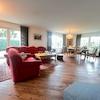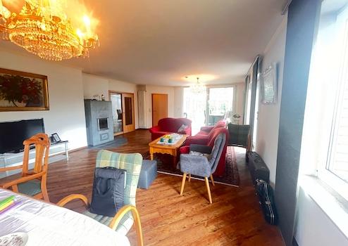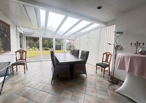 Das Herzstück dieses Bungalows bildet der lichtdurchflutete Wohnbereich mit großen bodentiefen Fensterschiebetüren, die einen fließenden Übergang zur sonnigen Terrasse und zum Wintergarten schaffen. Ein hochwertiger Specksteinofen sorgt in der kühleren Jahreszeit für behagliche Wärme und eine besonders gemütliche Atmosphäre.