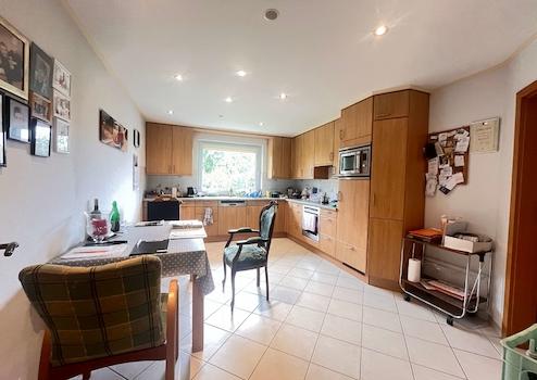 Die Wohnfläche von ca. 185 m² verteilt sich auf ein riesiges Wohnzimmer mit angrenzendem Wintergarten, eine große Küche, zwei ebenerdige Schlafzimmer, ein großzügiges Tageslichtbad mit Badewanne und ebenerdiger Dusche sowie ein zusätzliches Duschbad für Gäste. Alle Räume sind durchdacht geschnitten und bieten viel Wohnkomfort. Die moderne Einbauküche ist im Kaufpreis enthalten und lässt keine Wünsche offen.
