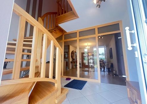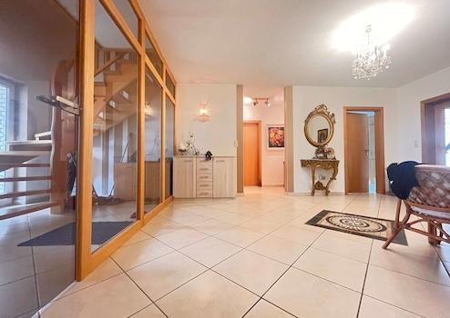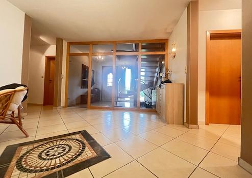 Auch praktisch überzeugt dieses Haus: Die direkt ans Wohnhaus angrenzende Garage mit zusätzlichem Geräteraum bietet ausreichend Stauraum und einen direkten Zugang zum Hausinneren. Der Eingangsbereich mit Windfang und Glaselementen empfängt Sie repräsentativ und hell.