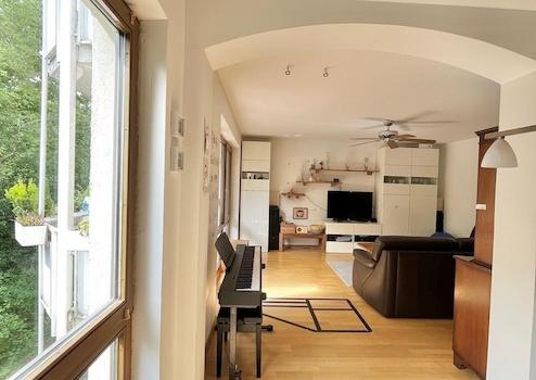 Die Wohnung befindet sich auf einem 4800 m2 großen Grundstück mit altem Baumbestand eines reinen Wohngebietes.