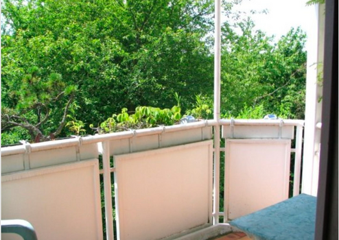 Die Balkon-Südseite des Gebäudes ist gut eingewachsen und gibt einen schönen Blick ins Grüne frei.