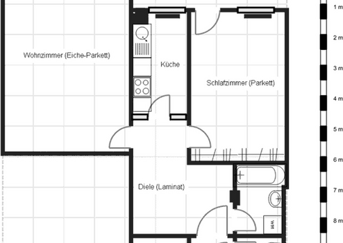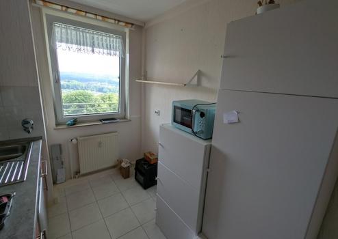 Diese gut geschnittene Wohnung für 1-2 Personen mit Traum-Blick Richtung Elberfeld/Hardthöhen und Süd-Balkon verfügt über ein großes Wohnzimmer (Parkettboden) mit Balkonaustritt sowie ein geräumiges Schlafzimmer (ebenfalls Parkettboden und Balkonaustritt). Vom Eingang gelangen Sie über eine Vor-Diele (mit großem Stauraum-Überbau) links in einen Vorratsraum, rechts zum WC, geradeaus in eine große Diele. Von dort aus geht es rechts in das Wannenbad (mit Anschluss für Waschmaschine). Geradeaus wartet eine eingerichtete Küchenzeile, die im Kaufpreis enthalten ist (Kühlschrank separat gestellt). Links schließt sich das Wohnzimmer an, rechts das Schlafzimmer.