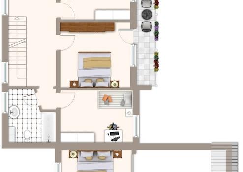 Im Obergeschoss bietet das Gebäude vier Schlafzimmer, ein Badezimmer, sowie einen Balkon (Westausrichtung).