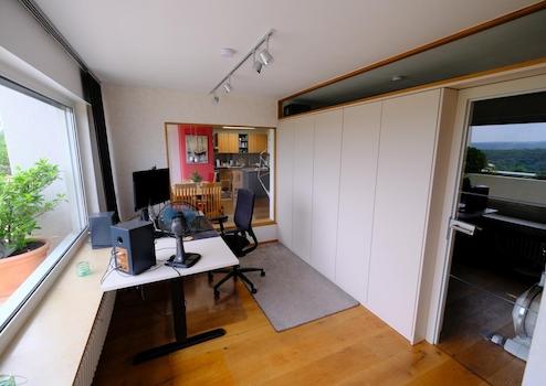 Das Herzstück der Wohnung ist der große lichtdurchflutete Wohn- und Essraum mit offener Küche. Von hier genießt man einen traumhaften Ausblick über das Ruhrtal und hat Zugang zur der riesigen Süd-Terrasse mit ca. 50qm, wobei nur ein Bruchteil in die Wohnflächenberechnung mit eingeht. Hier kann man fröhliche Stunden mit Freunden und Familie verbringen und ohne fremde Blicke entspannen. Der Balkon ist teilüberdacht und bietet auch eine elektrische Markise. An das Esszimmer schließt sich das Wohnzimmer an, wobei der Übergang fließend ist. Hier wurde vor 2 Jahren vom Schreiner mit Einbauschränken und Glaselementen ein zusätzliches Arbeitszimmer geschaffen, welches jedoch auch leicht zurückgebaut werden könnte. Dazu gibt es noch drei weitere Zimmer zur flexiblen Nutzung und zwei Badezimmer (eines mit Dusche und Badewanne und eines mit Badewanne und Anschlüssen für Waschmaschine und Co). Die Badezimmer haben im Zuge des Umbaus auch extratiefe Spiegeleinbauschränke vom Schreiner bekommen.