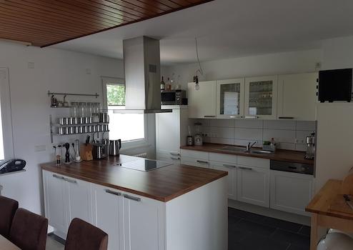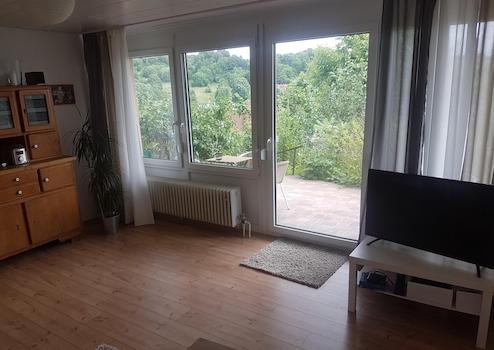 Die Hauptwohnung erstreckt sich über großzügige 142 m² und bietet eine moderne Raumaufteilung mit 5,5 Zimmern, die viel Platz für individuelle Gestaltungsmöglichkeiten lassen. Besonders hervorzuheben ist die Einbauküche mit Kochinsel, die nicht nur funktional, sondern auch ein Blickfang ist. Der große Balkon bietet einen herrlichen Ausblick über Wiesenbach und die umliegenden Felder – ein perfekter Ort, um den Tag ausklingen zu lassen.