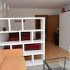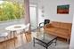 Wohnraum mit Sofa, Beistelltisch, Smart-TV, Tisch mit 2 Stühlen, Kleiderschrank, Regal als Raumtrenner,