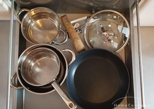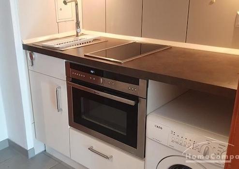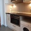 Offene Küchenzeile im Eingangsbereich, komplett ausgestattet mit kleiner Waschmaschine.