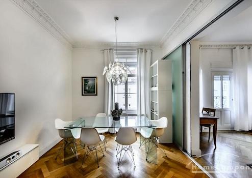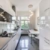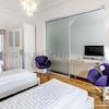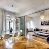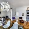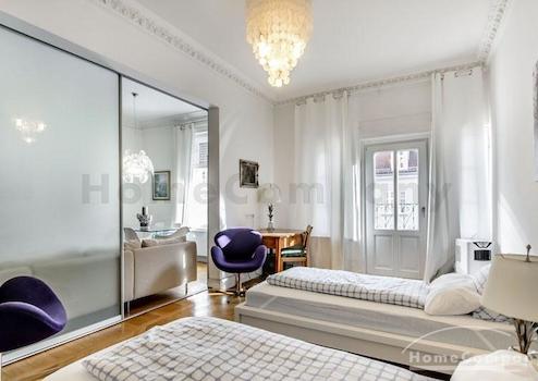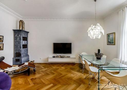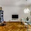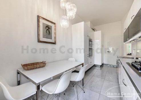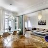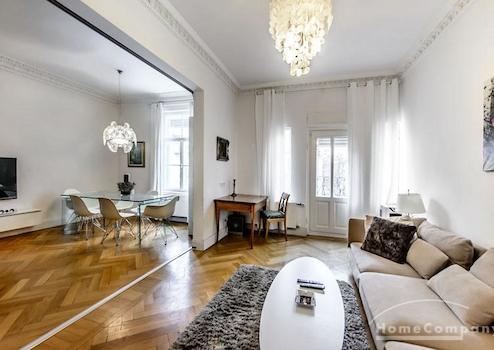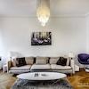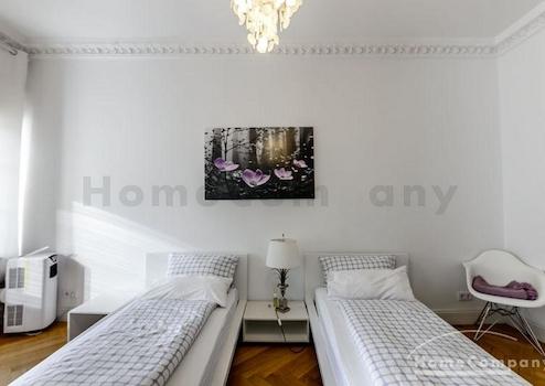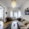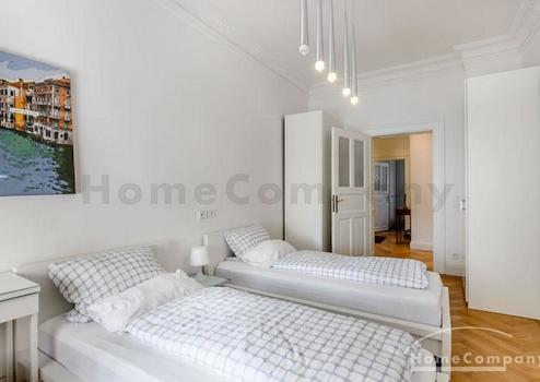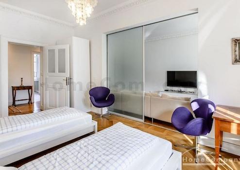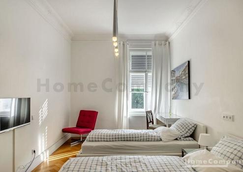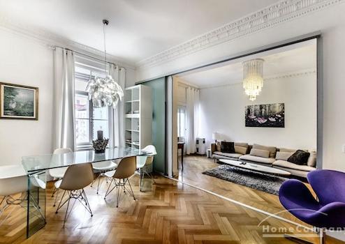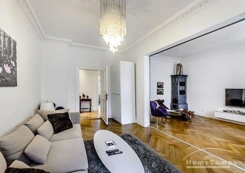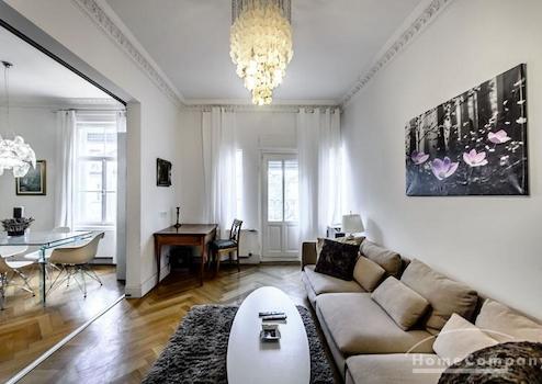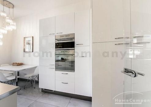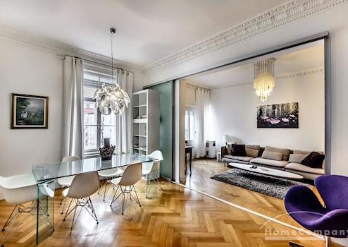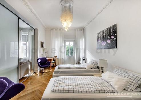 Das Wohnhaus ist ruhig, aber dennoch sehr zentral gelegen, die Wohnung selbst befindet sich im 3. Stock mit Aufzug. Das Wohnzimmer ist mit gemütlicher Couch und Lounge-Chairs sowie einem sehr schönen antiken Schreibtisch mit passendem Stuhl möbliert. Eine große Schiebetür trennt den Wohn- vom Essbereich. Hier befindet sich ein großer schöner Glastisch mit Sitzmöglichkeiten für 6 Personen. Die Wohnung verfügt über zwei Schlafzimmer, jeweils ausgestattet mit Doppelbett und großem Kleiderschrank und Flatscreen-TVs. Eines der Schlafzimmer hat ein En-suite-Bad mit Badewanne. Ein weiteres Badezimmer mit Tageslicht ist vom Flur aus zu betreten. Es ist mit Handtuchheizung und Dusche mit TV ausgestattet. Die Küche ist mit einem weiteren Essplatz für vier Personen und allem ausgestattet, was man für den täglichen Bedarf benötigt, unter anderem natürlich Backofen, Kochfelder und Spülmaschine. Waschmaschine und Trockner befinden sich in einer separaten Kammer. Sonstiges: Sehr hochwertig renoviert, moderne Ausstattung, Parkettböden. Internet inkludiert.