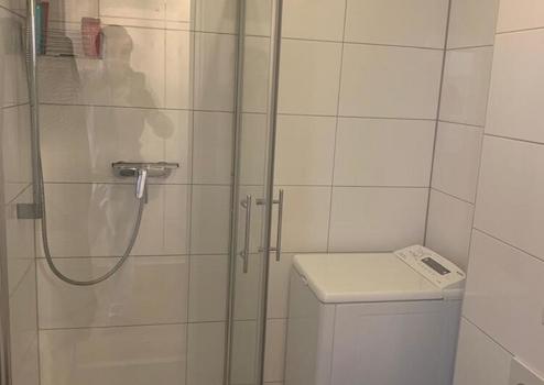 Das hell geflieste Bad verfügt über eine Dusche; hier befindet sich auch die eigene Waschmaschine.