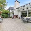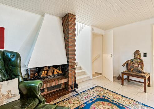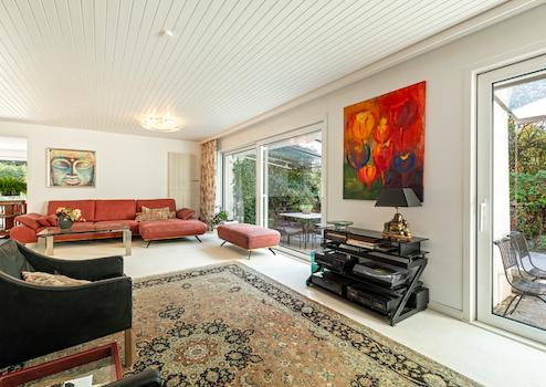 • Wohn-/Esszimmer mit bodentiefen Fenstern, (Schiebeelemente), heller Teppichboden, Zugang zur überdachten Süd-West-Hauptterrasse mit elektrischer Markise und Außenkamin