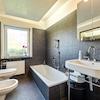 • Gäste-WC, beige Wandfliesen, Fenster