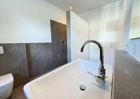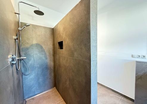 Hochwertige Sanitärobjekte, eine ebenerdige, barrierefreie Dusche, moderne Badmöbel und geschmackvolle Fliesen schaffen hier eine kleine Wellnessoase.