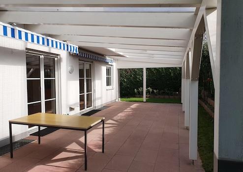 Massivholzparkettböden; Holztüren vom Schreiner; massive Buchenholz Podesttreppe vom Keller bis zum ausgebauten Dachstudio; Im Obergeschoß jedes Zimmer mit Balkonzutritt; Ein Süd und ein Westbalkon; Sauna mit Dusche; großer Hobbykeller; Kellerausgang mit 2 Schrägen um Fahrräder ganz leicht ins Freie zu schieben; Terrasse (ca. 40 m²) kpl. neu überdacht mit 2 Markisen zu beschatten. Neu überdachte Holzlege und oder Fahrradabstellplatz: