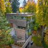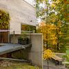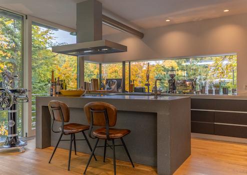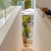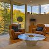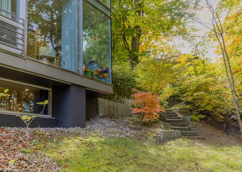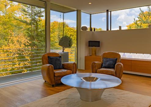 Gäste führt ein schwebender Steg in den offenen Wohn- und Essbereich. Glas, Holz und Licht formen eine Atmosphäre, in der Architektur und Natur verschmelzen. Im Lauf der Jahreszeiten offenbart das Anwesen ein wechselvolles Spiel aus Licht und Natur – ein ständiger Dialog zwischen Architektur und Umgebung.
