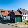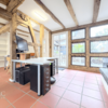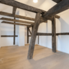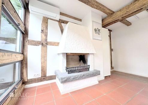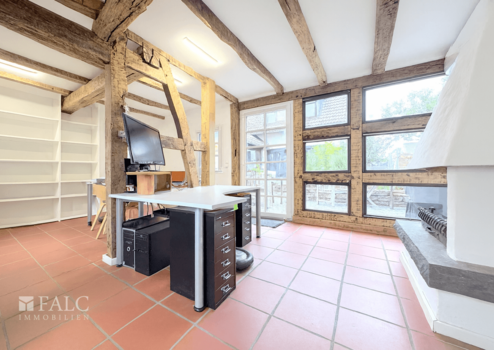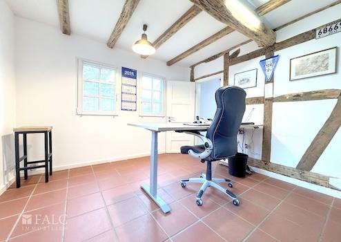 Von diesem Zwischenbereich aus führt der Weg nach rechts in das historische Fachwerkhaus, das im Jahr 2010 umfassend entkernt, gedämmt und technisch modernisiert wurde. Im Erdgeschoss erwarten den Besucher zwei charmante Räume, die sich ideal als Büros, Arbeitszimmer oder kreative Rückzugsorte eignen. Edle Holzböden und atmungsaktive Kalkfarbe schaffen ein gesundes Raumklima und unterstreichen den authentischen Charakter des Gebäudes. Ein offener Kamin sorgt für eine warme, inspirierende Atmosphäre. Ergänzt wird das Erdgeschoss durch ein eigenes Badezimmer sowie einen kleinen Keller, der zusätzlichen Stauraum bietet. Über eine Treppe gelangt man in das Obergeschoss des Fachwerkteils, wo zwei weitere gemütliche Zimmer zur Verfügung stehen und als Schlaf-, Gäste- oder Hobbyräume genutzt werden können.