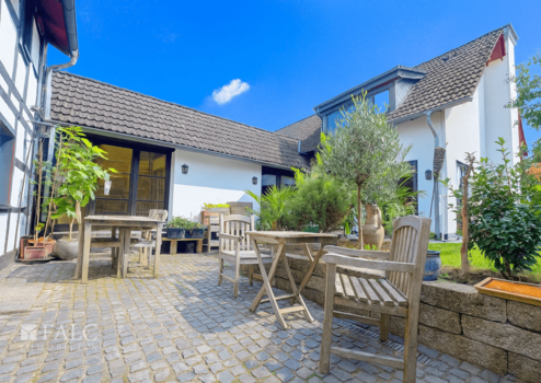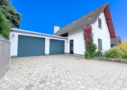 Praktische Details runden das Gesamtbild ab. Eine große Doppelgarage bietet Platz für Fahrzeuge und zusätzlichen Stauraum, während der vollständig neu angelegte Garten aus dem Jahr 2012 zum echten Blickfang geworden ist. Hier können Sie entspannte Stunden im Grünen genießen – ob auf der Terrasse, im Schatten alter Bäume oder am hauseigenen Brunnen, der dem Garten eine besondere Atmosphäre verleiht und zugleich für die Bewässerung genutzt werden kann.