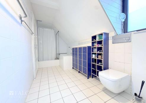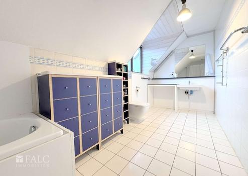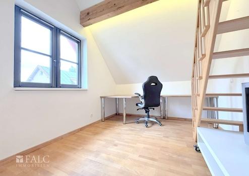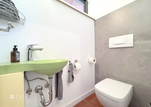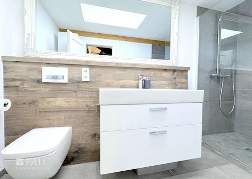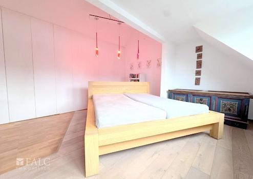Auch in den privaten Rückzugsbereichen wurde großer Wert auf Qualität gelegt: Das Badezimmer und das Gäste-WC im Erdgeschoss wurden vor rund fünf Jahren hochwertig renoviert und präsentieren sich in modernem Design mit zeitlosen Materialien. Das Schlafzimmer begeistert mit einem begehbaren Kleiderschrank, der großzügigen Stauraum und Ordnung auf elegante Weise verbindet.