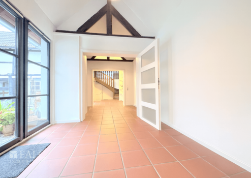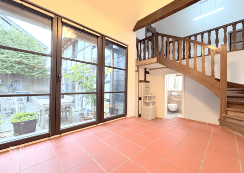 Bereits beim Betreten der Immobilie wird deutlich, dass es sich hier um ein außergewöhnliches Wohnensemble handelt, das ein liebevoll restauriertes Fachwerkhaus aus dem 18. Jahrhundert mit einem stilvollen, modernen Anbau harmonisch vereint. Der zentrale Eingangsbereich fungiert als verbindendes Element beider Gebäudeteile und heißt Bewohner und Gäste in einem einladenden Ambiente willkommen. Hier befindet sich auch ein modernisiertes Gäste-WC.