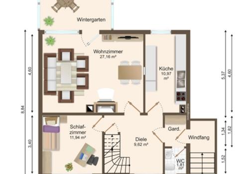 - Erdgeschoss: Wohnbereich, Küche, Schlafzimmer, Gäste-WC