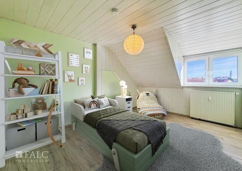 • Das Ober- und Dachgeschoss bietet ca. 136 m² Wohnfläche mit 6 hellen, großzügigen Zimmern und zusätzlichem Gäste-WC. Das Badezimmer ist sowohl mit Badewanne als auch Dusche ausgestattet, und die gepflegte Einbauküche ist im Kaufpreis enthalten. Vom Dachgeschoss aus genießt man einen herrlichen Blick über die Stadt.