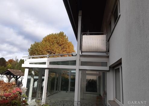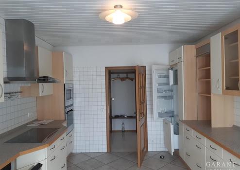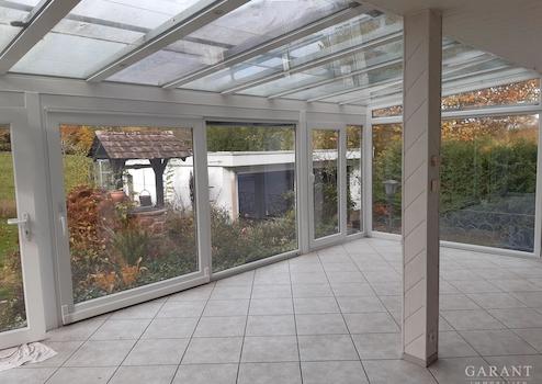 Die ca. 140 Quadratmeter große Wohnung im Erdgeschoss steht leer, könnte also nach eventuellen Renovierungen bald bezogen werden. Das Herzstück hier ist der riesige, ganzjährig nutzbare Wintergarten mit toller Aussicht ins Grüne. Die offene Küche grenzt an, hier macht das Kochen Spaß!