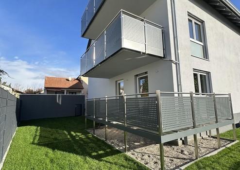 - Die Balkone erhalten ein Geländer aus Edelstahl mit gelochten Metallplatten,